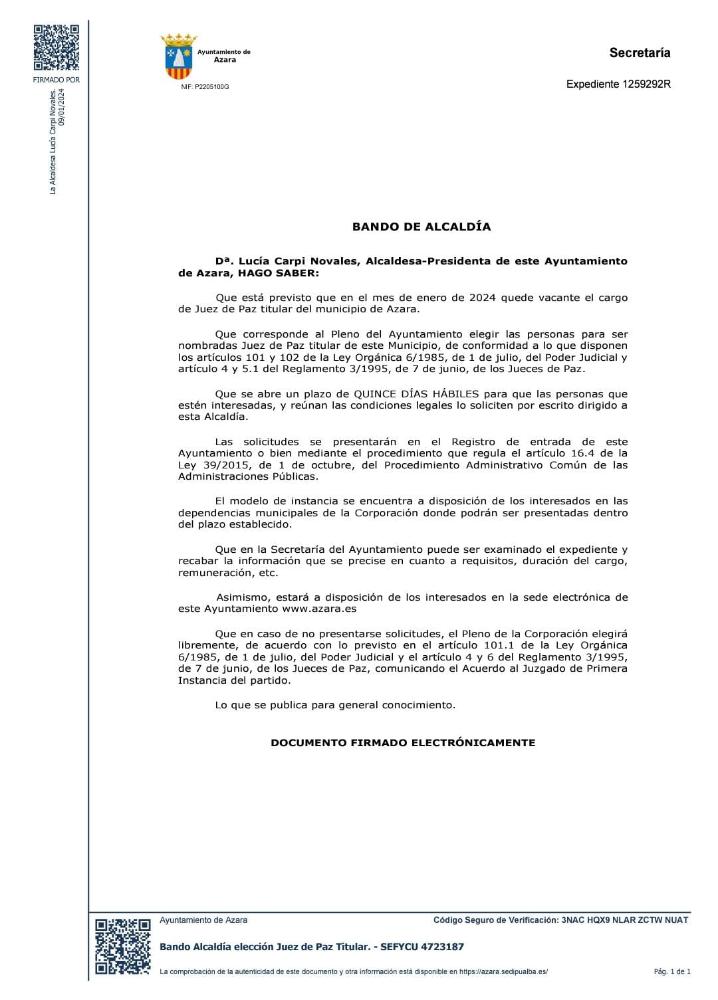 El Ayuntamiento de Azara ha publicado un bando en el que se informa que queda abierto el plazo para solicitar la plaza de Juez de Paz titular de la localidad. Este puesto quedará vacante en el mes de enero en curso.