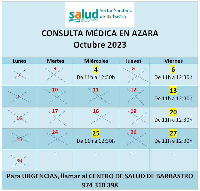 El Consultorio médico de Azara, durante el mes de octubre, atenderá a la población dos días a la semana: miércoles y viernes en horario de 11h a 12:30h.